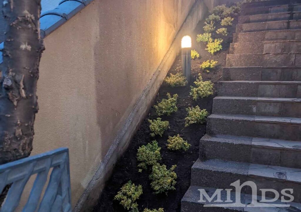 鎌倉市のリノベーション物件、売り出し前のエクステリアが整いました。 ライトアップされたアプローチ階段を上がっていくとシンボルツリーのヤマボウシが迎え入れてくれる落ち着いた雰囲気の玄関です。 鎌倉市 リノベーション工事 施工中 横浜市 K様邸 施工中
