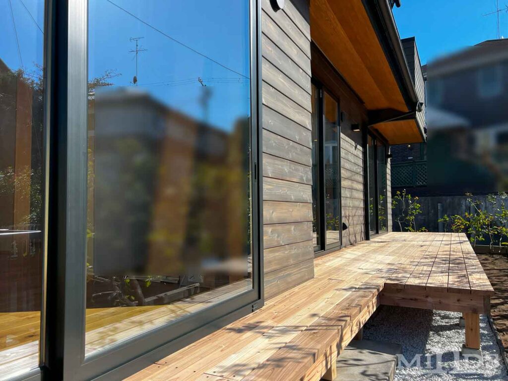 鎌倉市のリノベーション、ほぼ完成です♪ リビングダイニングからの掃き出し窓を開けると、このウッドデッキに繋がります。屋久杉の贅沢な空間です♫ 葉山町 M様邸 先行工事 完成 鎌倉市 リノベーション工事 完成