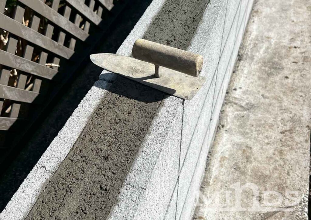 M様邸 外回りのフェンスの基となるコンクリートブロックが積まれています。 なぜか、こてが単独でシュールな雰囲気を醸し出しています… が、職人さんがちゃんと綺麗に仕上げていきますよ!! 鎌倉市 リノベーション工事 施工中 鎌倉市 リノベーション工事 施工中