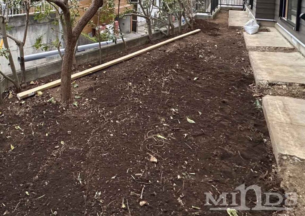 鎌倉市 リノベーション物件 お庭を一掃中 生い茂っていた植物が処分されて土の部分がしっかりと見えてきました。 こちらにウッドデッキの基礎を作っていきます。 葉山町 リノベーション工事 完成 その4 葉山町 M様邸 先行工事 施工中