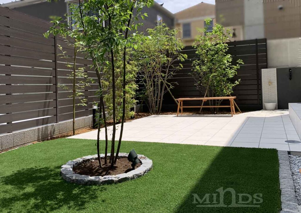 お庭はタイル貼りのテラスと人工芝で機能性と癒しのプライベート区間を両立しています☆