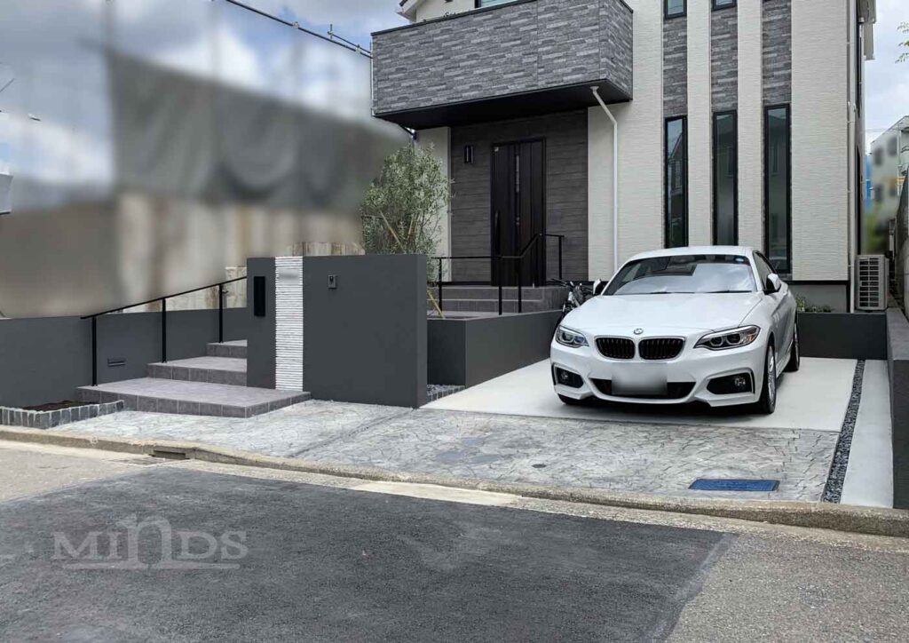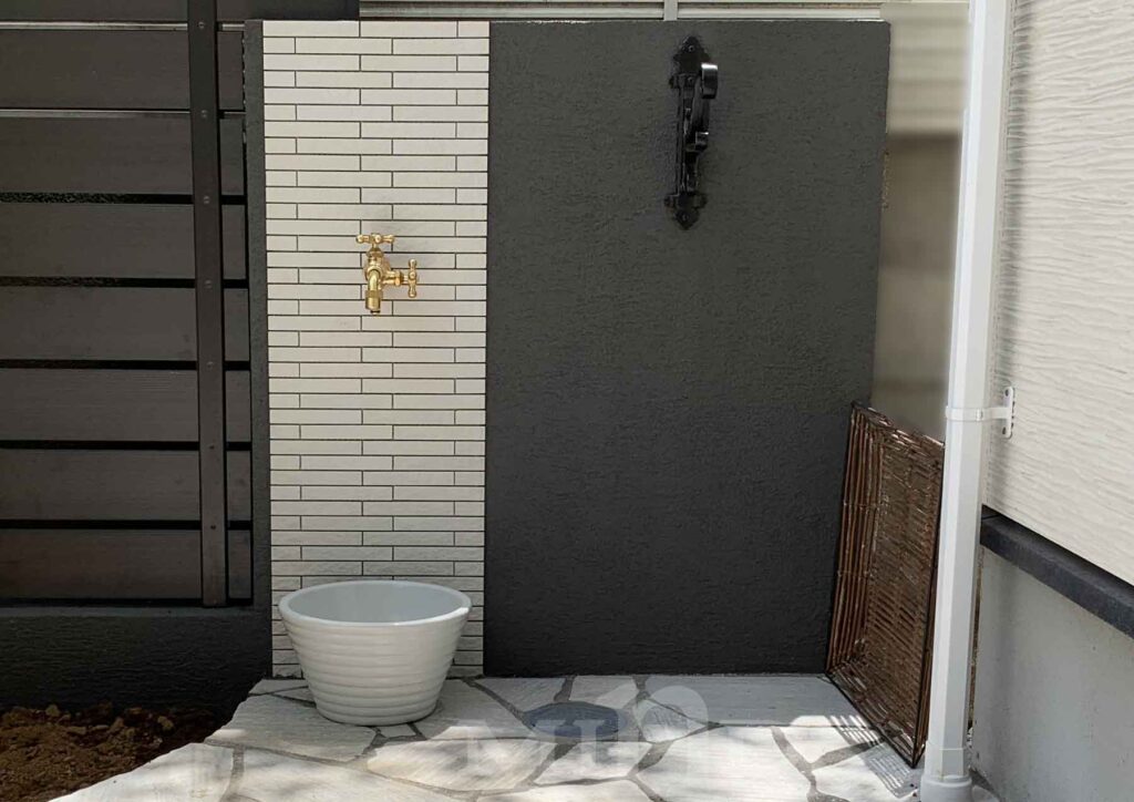 外水道は二口の蛇口にホースハンガーと使いやすさが重視されているのにおしゃれ♪駐車場側とお庭と両方に設置しました。